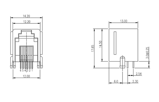Modular Jack, RJ11, 1*1 port Contacts: 6P6C / 6P4C / 6P2C Tab up, without panel stops, through hole, side entry